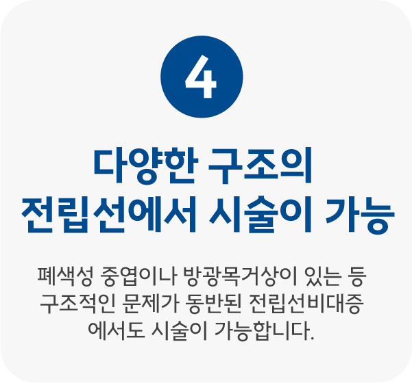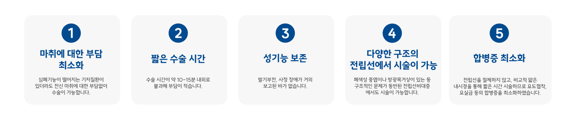 리줌도 합병증이 없는 것은 아닙니다. 적절하지 않은 위치에 시술하지 않을 경우 정액량이 크게 감소하거나 방광 경부 협착 등의 합병증이 생겨 오히려 수술 전보다 심한 증상을 호소할 수 있습니다. 따라서 정확한 위치와 간격으로 계획하고 시술할 수 있는 의료기관을 찾으셔야 합니다.